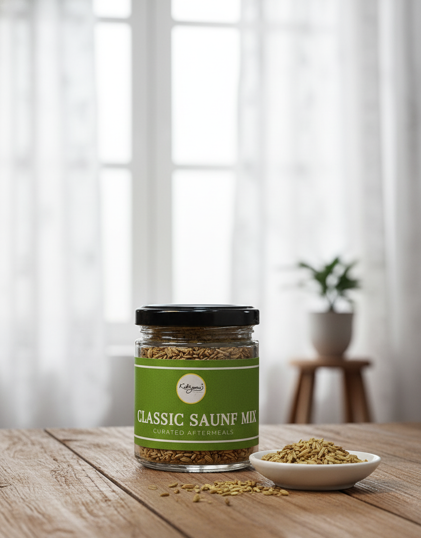 Classic Saunf Mix is a traditional Indian mouth freshener made primarily with fennel seeds (saunf), often blended with other digestive and aromatic ingredients. It is commonly served after meals to freshen breath, aid digestion, and provide a pleasant cooling aftertaste.