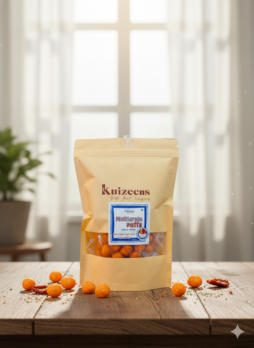 Light, crunchy, and full of wholesome goodness, Multigrain Puffs are a delicious snack crafted from a nourishing blend of ancient grains like jowar (sorghum), bajra (pearl millet), ragi (finger millet), quinoa. These airy puffs are roasted or lightly baked (never fried), offering a guilt-free munching experience packed with fiber, plant-based protein, and essential nutrients.Perfect for health-conscious snackers, they come seasoned with subtle spices or herbs to add just the right amount of flavor without overpowering the natural grainy taste. Ideal as a mid-day bite, tiffin snack, or party munchie, Multigrain Puffs are a tasty way to satisfy your cravings while staying on track with your wellness goals.