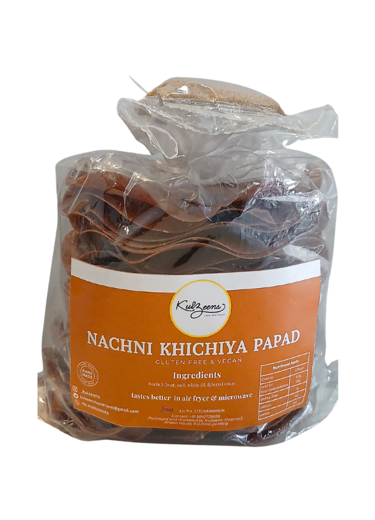 Nachani Khichiya Papad is a crunchy, wholesome papad made from nutritious ragi (nachani) flour blended with traditional khichiya ingredients for a light yet hearty bite. Rich in calcium, fiber, and minerals, it’s a healthy twist on the classic papad that’s perfect for roasting or frying.