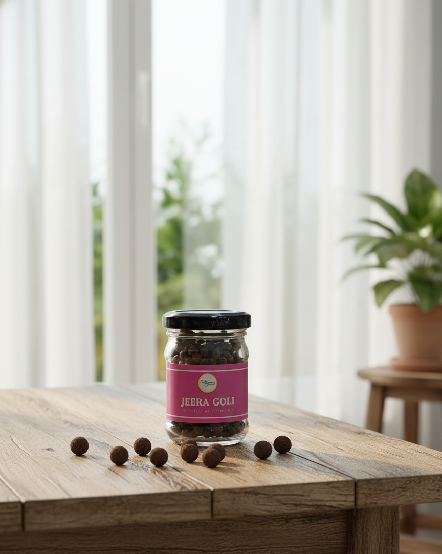 Tangy, salty, and delightfully spiced, Salted Jeera Goli is a traditional digestive made with roasted cumin seeds, natural salts, and aromatic spices. Known for its zesty flavor and digestive benefits, this small yet flavorful treat is perfect after meals or as a quick palate refresher.